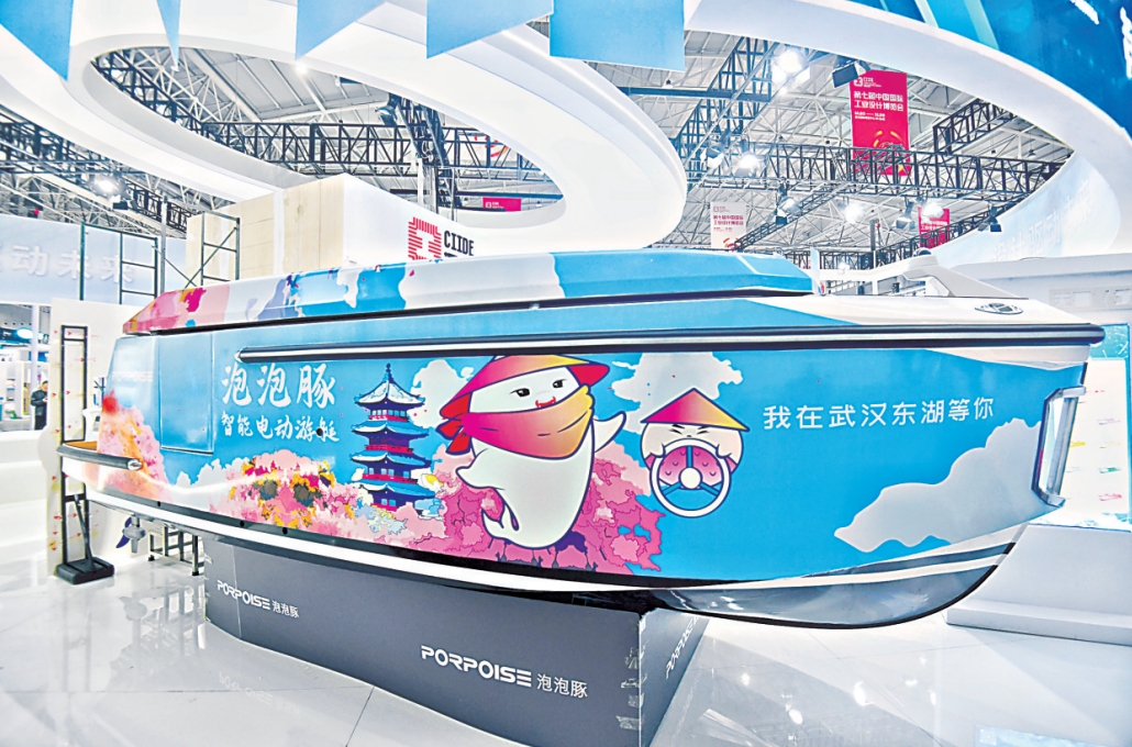 无疆(武汉)技术有限公司展出的泡泡豚智能电动游艇。
